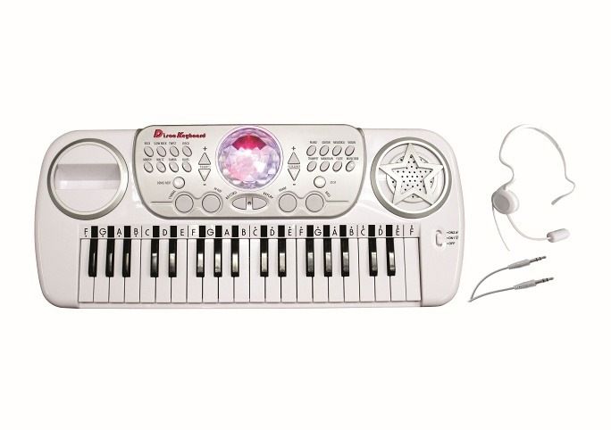 Klávesy s disco koulí a mikrofonem. Rozměry 50x21 cm. Disco koule se světelnými efekty. 37 kláves (bílé, černé). Funkce - 22 ukázkových skladeb, 8 nástrojů, 8 rytmů, nastavení rychlosti tempa, 4 bicí, nahrávání a následné přehrávání, nastavení hlasitosti, konektor na připojení mobilu/mp3 přehrávače, automatické vypínání pro úsporu energie. 4xAA baterie a kabel na připojení externího zařízení součástí.