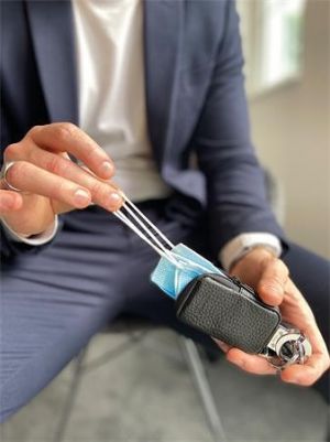 Jedna část je držák na klíče, druhá malé úložiště. Malá kožená taška POCKET CLICK má dostatek prostoru přesně pro jednu ústní a nosní roušku.