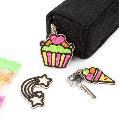 Přívěšek na klíče, batoh, tašku nebo penál ve tvaru: zmrzliny, muffina a duhy. Dřevěnou klíčenku stačí vyplnit barevnou pěnovou hmotou: zelenou, žlutou, oranžovou nebo růžovou. Po zaschnutí provlékneme kovový řetízek a máme hotovo :).