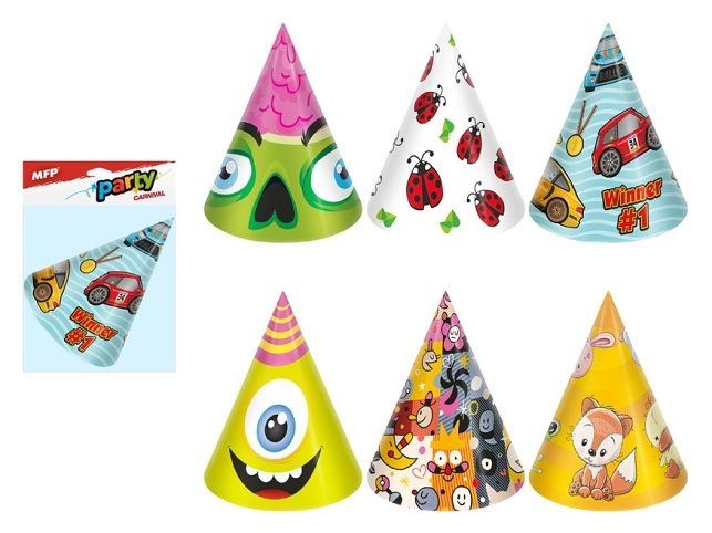 Narozeninový papírový párty klobouček. Karnevalový klobouček velice dobře drží na hlavě, díky kloboukové gumičce, kterou si dáte pod bradu. Udělejte radost oslavenci a uspořádejte velkou párty. Nezapomeňte koupit i frkačky a trumpety. BALENÍ OBSAHUJE: - 6 ks barevných kloboučků s dětskými motivy (viz obrázek) Výška kloboučku: 16 cm Obvod kloboučku 32 cm Délka gumičky: 36 cm VAROVÁNÍ: Nevhodné pro děti do 3 let. Nebezpečí vdechnutí a spolknutí malých částic. Uvedená cena je za 1 balení po 6 ks. Baleno v sáčku se závěsem.