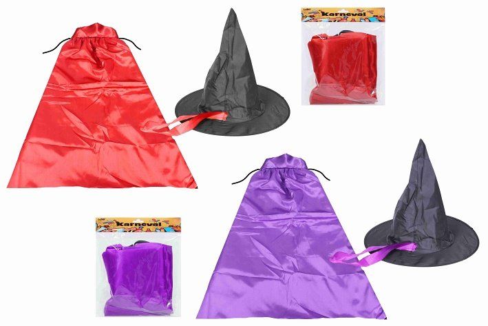 Čarodějnický plášť s kloboukem budou skvělým kostýmem na halloweenskou párty nebo na karneval! Vybrat si můžete červenou nebo fialovou variantu.