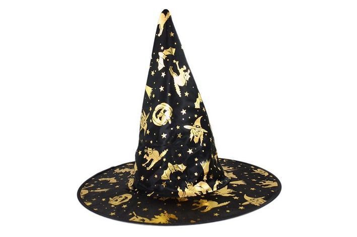 Veselý halloweenský klobouk je skvělým doplňkem na besídku nebo karneval! Klobouk černé barvy je zdoben zlatými magickými motivy.