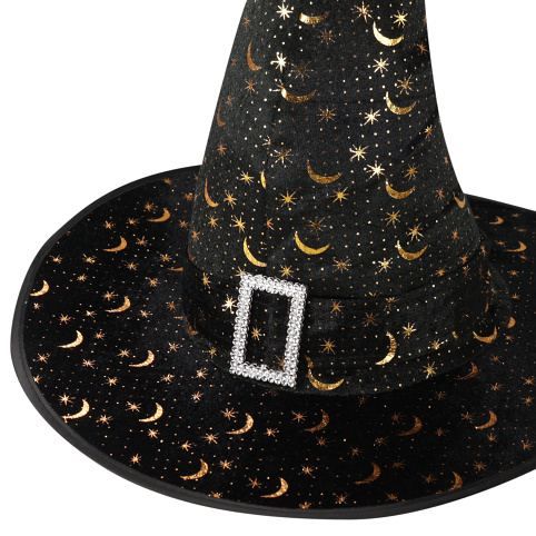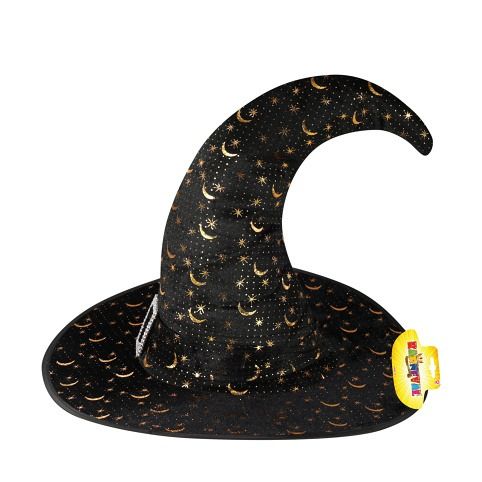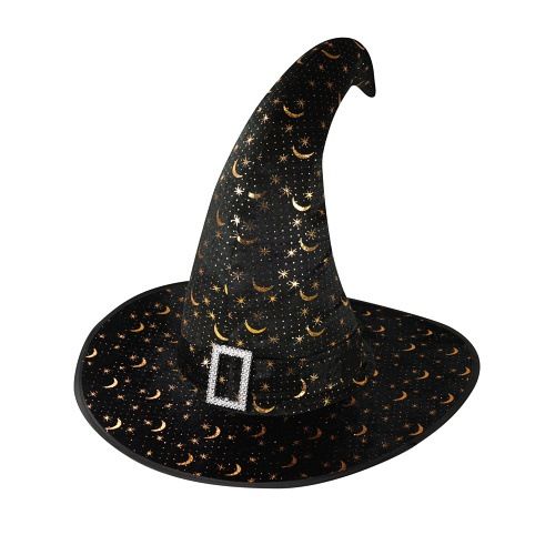 Stylový čarodějnický klobouk pro dospělé v černé barvě se zlatým potiskem a stříbrnou sponou. Staňte se hvězdou karnevalového nebo halloweenského večírku díky tomuto nepřehlédnutelnému klobouku!
