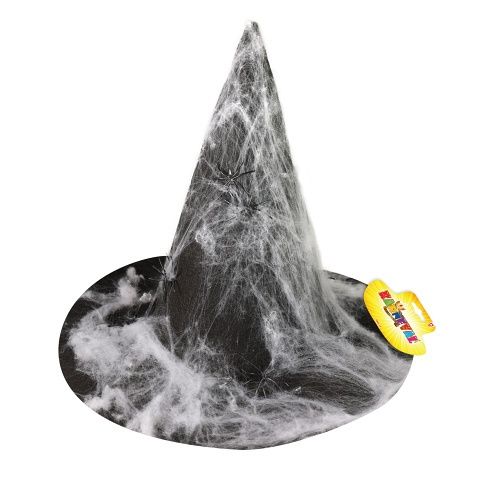 Čarodějnický klobouk s pavučinou, která vypadá jako opravdová! Klobouk černé barvy je určen pro dospělé, je potažen pavučinou a mini pavouky. Klobouk je vyroben z filcu. Perfektní doplněk na Halloween párty nebo karneval!
