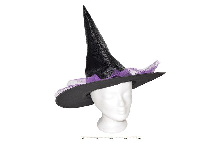 Klobouk na karneval jako doplněk ke kostýmu čarodějnice. Pokud se chystáte na párty nebo halloweenskou oslavu tento klobouk nesmí chybět ve vašem šatníku. Rozměry: obvod hlavy 58 cm, průměr 41 cm, výška 36 cm.