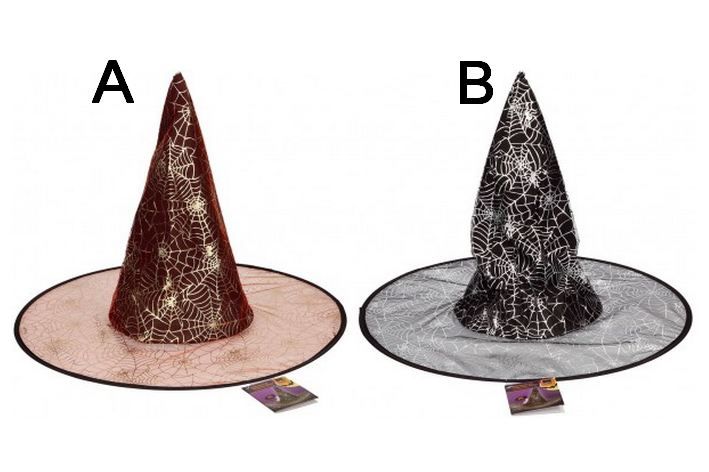 Čarodějnický textilní klobouk s dekorem pavučiny. Univerzální velikost. Výška 46 cm.