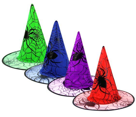 Čarodějnický klobouk vhodný na karnevaly- mix barev- výška: 34cm- průměr okraje: 38cm- průměr otvoru: 18cm