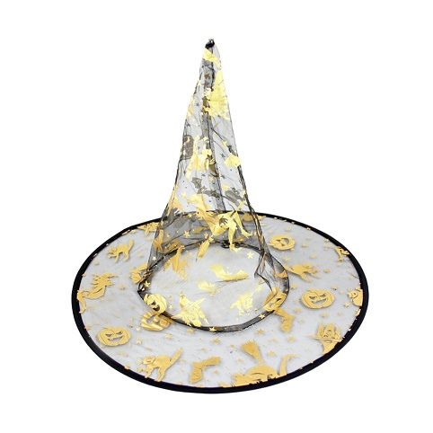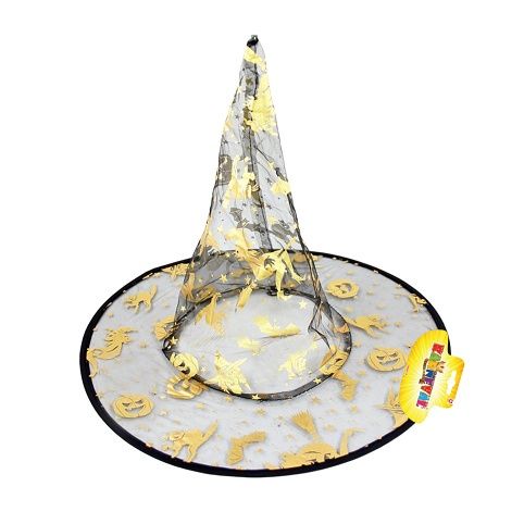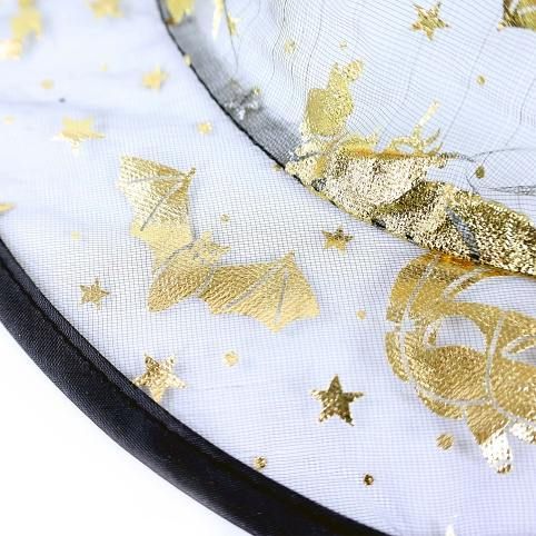 Kobouk je vyroben z černé síťky a je zdoben zlatými obrázky. Staň se hvězdou věčírku díky tomuto klobouku