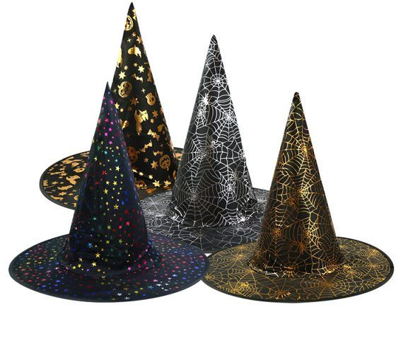 Čarodějnický klobouk vhodný na karnevaly- mix barev- výška: 34cm- průměr okraje: 38cm- průměr otvoru: 18cm