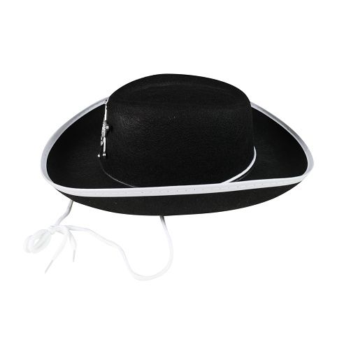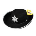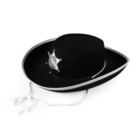 Senzační klobouk pro malé šerify! Tento černý elegán je zdoben opravdickým odznakem s nápisem SHERIFF a stříbrným lemováním.