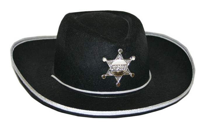 Senzační klobouk pro malé šerify! Tento černý elegán je zdoben opravdickým odznakem s nápisem SHERIFF a stříbrným lemováním.