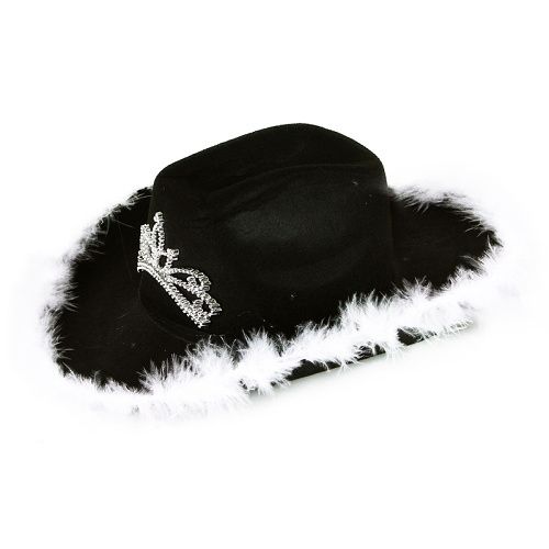 Kovbojský dámský klobouk je vysoký 15 cm. Tento černý elegán je zdoben stříbrnou korunkou a po okrajích lemován bílým peřím. Klobouk je určen pro dospělé. Staňte se hvězdou večírku díky tomuto nepřehlédnutelnému klobouku!