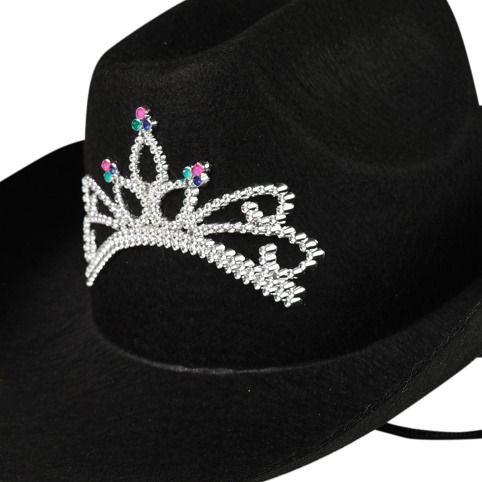Tento černý elegantní kovbojský klobouk je zdoben stříbrnou korunkou. Klobouk je určen pro dospělé. Kovbojský dámský klobouk je vysoký 14 cm. S tímto kloboukem budeš nepřehlédnutelná!