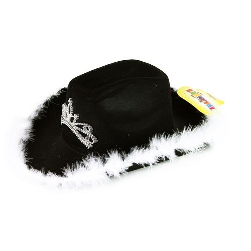 Kovbojský dámský klobouk je vysoký 15 cm. Tento černý elegán je zdoben stříbrnou korunkou a po okrajích lemován bílým peřím. Klobouk je určen pro dospělé. Staňte se hvězdou večírku díky tomuto nepřehlédnutelnému klobouku!