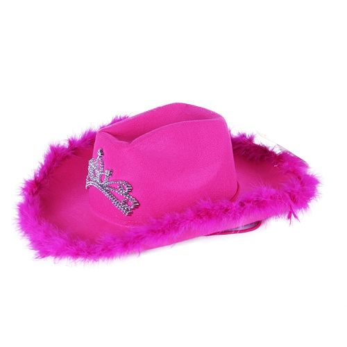 Tento růžový elegantní kovbojský klobouk je zdoben stříbrnou korunkou a po okrajích lemován peřím stejné barvy. Klobouk je určen pro dospělé. Kovbojský dámský klobouk je vysoký 15 cm. S tímto kloboukem budeš nepřehlédnutelná!