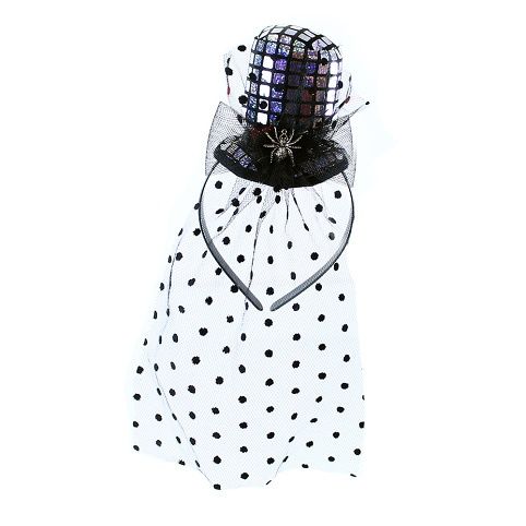Elegantní mini klobouk v černé barvě se stříbrnými flitry, závojem a navíc zdobený malým pavoučkem. Klobouk je upevněn na čelence.