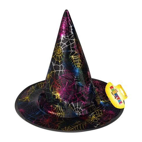 Veselý halloweenský klobouk je skvělým doplňkem na besídku nebo karneval! Klobouk černé barvy je zdoben barevnou pavučinkou.