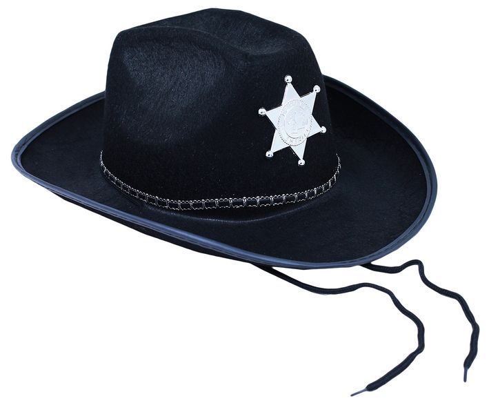 Karnevalový klobouk šerif černé barvy s odznakem a stříbrným lemováním. Klobouk je určen pro dospělé.