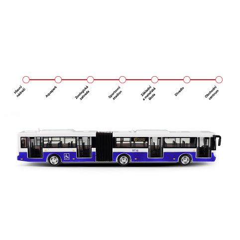 Kloubový autobus který hlásí zastávky česky 36 cm modrý