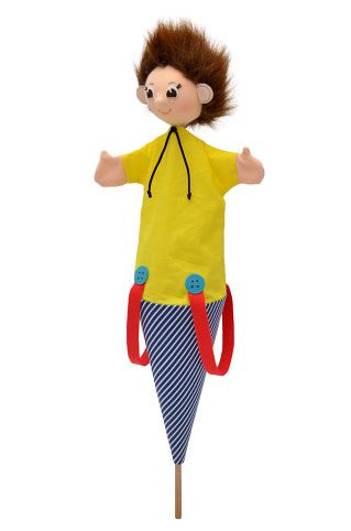 Kornoutový maňásek "3v1" = loutka+maňásek+schránka na drobnosti. Ovládá se dřevěnou tyčkou, kterou také schováte celou postavičku do kornoutu. Otvorem na zádech ovládáte ruce, tak jako u maňásků, nebo vložíte drobné dárky do kornoutu.