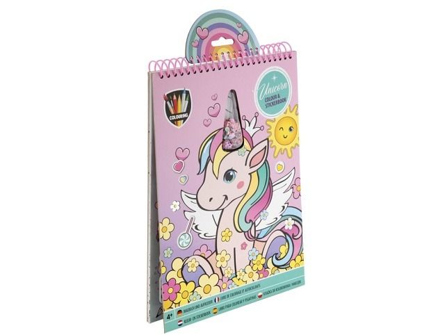 Kniha omalovánek + nálepek A4 Jednorožec – obsahuje 16 stran omalovánek včetně samolepek.