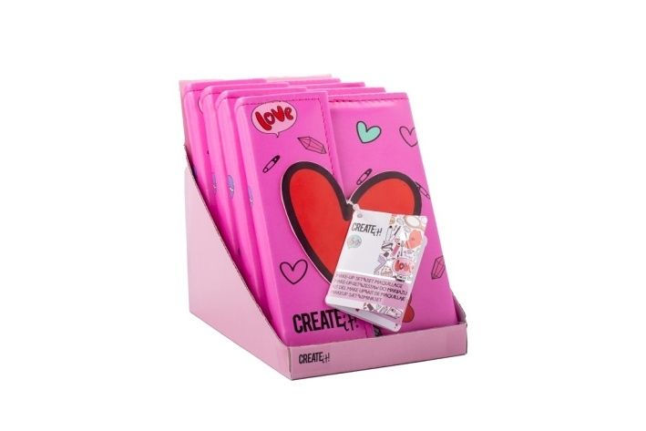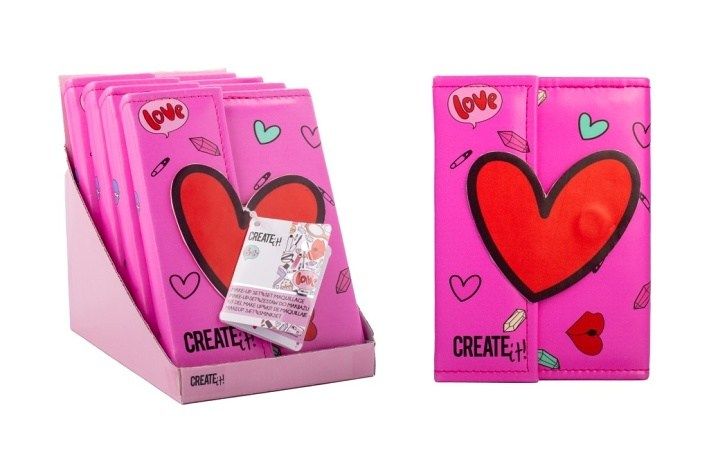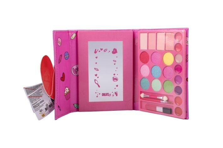 Kniha s líčením na magnet – hniha po rozevření obsahuje aplikátor na oční stíny, štetec, šteček, 4× make up, 9 barev očních stínů a 8 barev rtěnek + zrcátko.