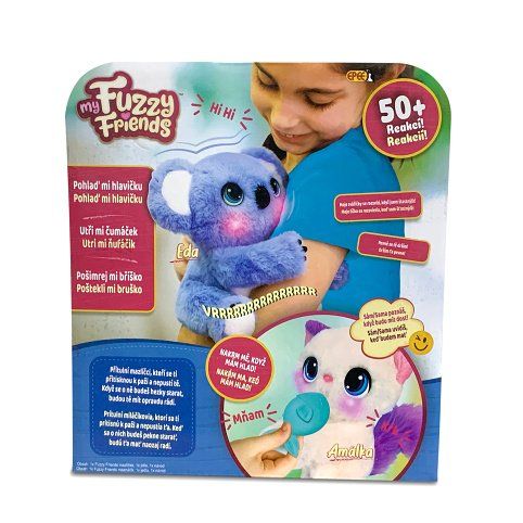 "Roztomilé plyšové zvířátko My Fuzzy Friends Koala. Extra dlouhé ruce a nohy těchto interaktivních mazlíčků se chytí do dětských paží a láskyplně je obejme. Pokud něco koala potřebuje, rozsvítí se jí tvářičky (4 různé barvy) a vydá speciální zvuk. Koala pohybuje hlavou, aby se přitulila jako skutečné zvířecí mládě a má více než 50 zvuků a reakcí. Výrobek vyžaduje 3x AAA baterie, jsou součástí balení. Pro děti od 4let.