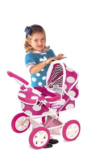 Hluboký kočárek Bambolina. Je růžový s bílými puntíky. Součástí kočárku je úložný košík pod korbičkou kočárku. Kočárek je vhodný pro děti od 3 let.