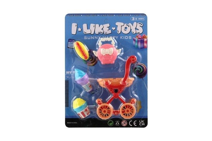 Kočárek mini s doplňky plast 9x13cm 4 barvy na kartě 18x25x6cm