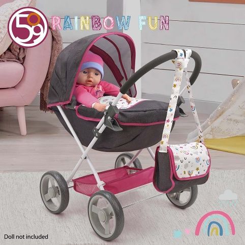 Kočárek pro panenky 509 Crew Carol. Komfortní pěnová rukojeť. Stahovací stříška. Velký nákupní košík. Skladací pro snadné skladování. Pohodlně se hodí pro panenku 13" - 18"