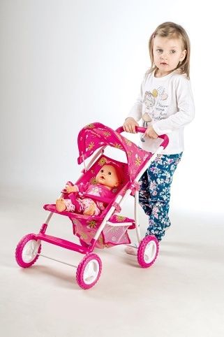 Sportovní kočárek pro panenku se stříškou a úložným prostorem vespod kočárku. Stříšku lze jednoduše sklopit.