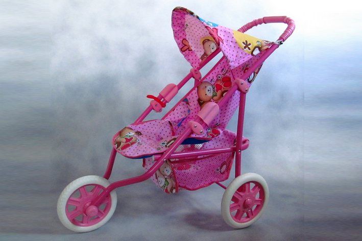 Kočárek sportovní (tříkolový-trojkolka) pro panenky, kovová konstrukce, v barvě růžové, rozměry: šířka 36cm, výška 60cm, délka 72cm