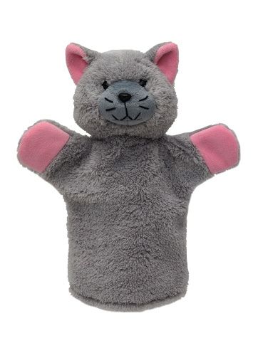 Textilní maňásek po zmáčknutí bříška mňouká jako kočička. Vyměnitelné baterie 2xLR44 jsou součástí.