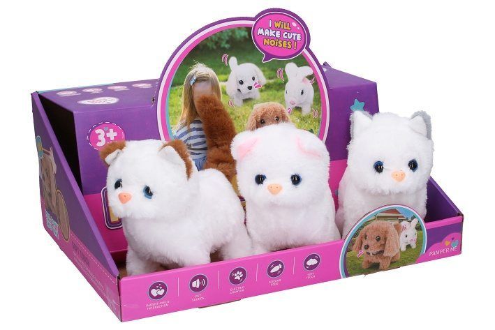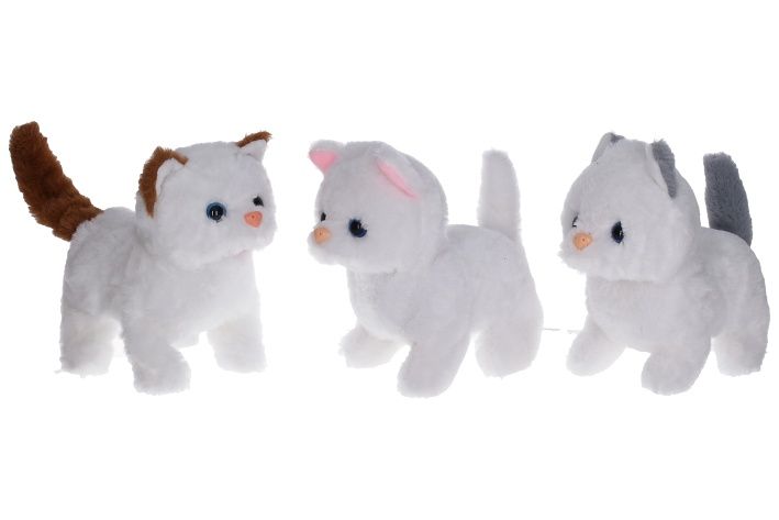 Kočka chodící se zvukovými efekty. Rozměry 16x9x12 cm. Display box - 8 ks. Chodí, hýbá ocasem a mňouká. ON/OFF přepínač na spodní straně. 2xAA baterie nejsou součástí.