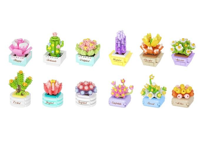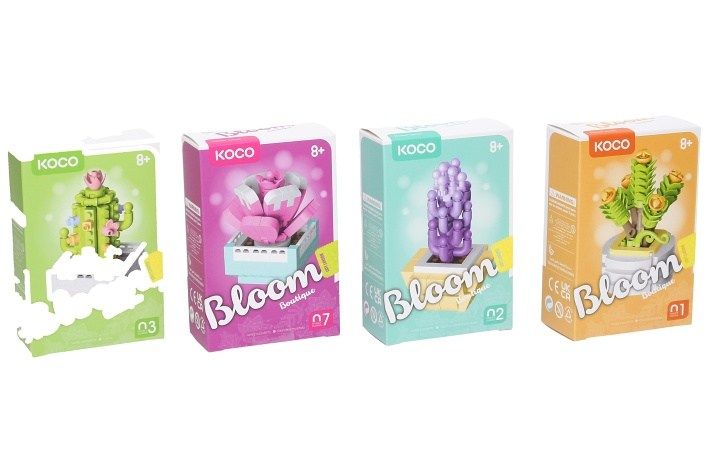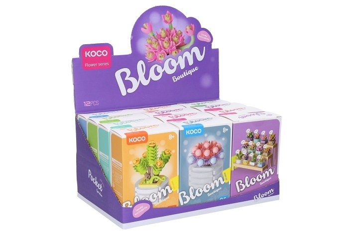 KOCO stavebnice mini rostliny. 12 různých ks v display boxu. Obsahuje kostičky, nástroj na oddělení kostiček, podrobný obrázkový návod na složení.