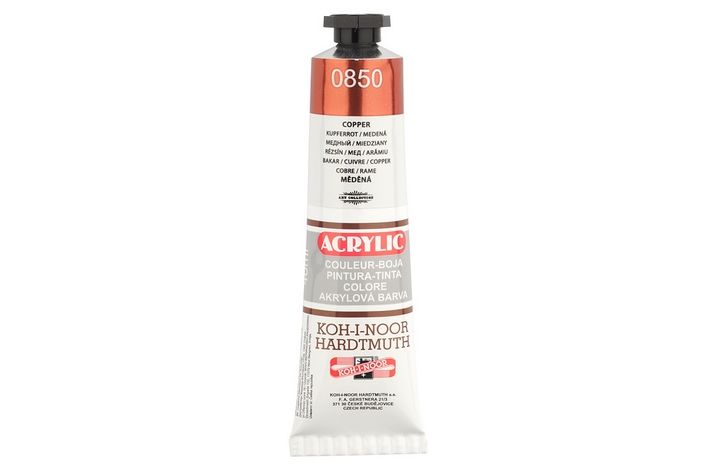 Barva akrylová 40ml měděná 0850. Jedná se o vodou ředitelné disperzní barvy vysoké kvality. Lze je nanášet štětcem, válečkem nebo špachtlí na jakýkoliv nemastný podklad. Barvy se vyznačují vysokým obsahem pigmentu a barevnou světlostálostí. Po zaschnutí vytvoří pružný nekřehnoucí film odolný vůči stárnutí.Mezi další výhody těchto barev patří také vzájemná mísitelnost a krátká doba zasychání.Vyrábí se ve 32 odstínech.