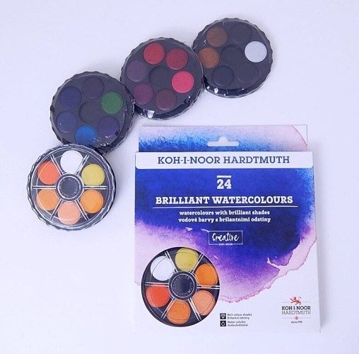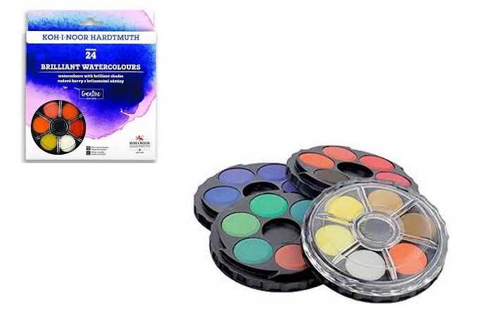 Vodové barvy o průměru tablet 22,5 mm s 24 brilantními odstíny vhodné pro speciální výtvarné techniky, např. pro kolorování fotografií, malby portrétů, malby na dekorační předměty, zdobení kraslic aj. Vložené v plastovém barevníku s transparentním víčkem.