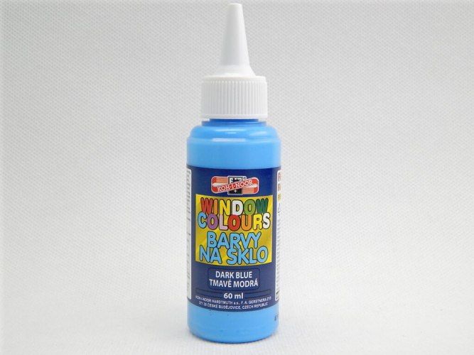Barvy na sklo se používají k malování na sklo, zrcadlo, obkladačky a jiné hladké povrchy. Nejprve se barva nanese přímo z lahvičky na fólii. Po zaschnutí se obrázek z fólie opatrně odtrhne a nalepí na požadovaný povrch. Tmavě modrá barva na sklo v 60 ml, průhledné lahvičce. Barva na sklo se používá k malování na sklo, zrcadlo, obkladačky a jiné hladké povrchy. Nejprve se barva nanese přímo z lahvičky na fólii. Po zaschnutí se obrázek z fólie opatrně odtrhne a nalepí na požadovaný povrch. Určeno pro děti starší 3 let. Dítě pozře barvu. Barva projde trávicím traktem bez ovlivnění traktu - dle citlivosti uživatele může vyvolat nevolnost, průjem, zvracení.