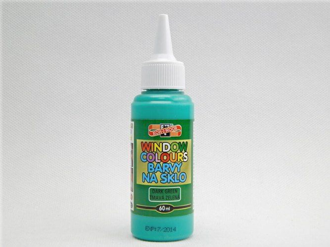 Barvy na sklo se používají k malování na sklo, zrcadlo, obkladačky a jiné hladké povrchy. Nejprve se barva nanese přímo z lahvičky na fólii. Po zaschnutí se obrázek z fólie opatrně odtrhne a nalepí na požadovaný povrch. Tmavě zelená barva na sklo v 60 ml, průhledné lahvičce. Barva na sklo se používá k malování na sklo, zrcadlo, obkladačky a jiné hladké povrchy. Nejprve se barva nanese přímo z lahvičky na fólii. Po zaschnutí se obrázek z fólie opatrně odtrhne a nalepí na požadovaný povrch. Určeno pro děti starší 3 let. Dítě pozře barvu. Barva projde trávicím traktem bez ovlivnění traktu - dle citlivosti uživatele může vyvolat nevolnost, průjem, zvracení.