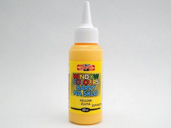 Barvy na sklo se používají k malování na sklo, zrcadlo, obkladačky a jiné hladké povrchy. Nejprve se barva nanese přímo z lahvičky na fólii. Po zaschnutí se obrázek z fólie opatrně odtrhne a nalepí na požadovaný povrch. Žlutá barva na sklo v průhledné 60 ml lahvičce s tryskou a bílým uzávěrem. Barva na sklo se používá k malování na sklo, zrcadlo, obkladačky a jiné hladké povrchy. Nejprve se barva nanese přímo z lahvičky na fólii. Po zaschnutí se obrázek z fólie opatrně odtrhne a nalepí na požadovaný povrch. Určeno pro děti starší 3 let. Dítě pozře barvu. Barva projde trávicím traktem bez ovlivnění traktu - dle citlivosti uživatele může vyvolat nevolnost, průjem, zvracení.
