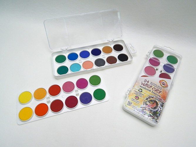 Školní vodové barvy 24 odstínů s tabletami o průměru 30 mm v obdélníkových, dvoupatrových, plastových barevnících s papírovou vložkou. Barvy jsou řazeny ve dvou patrech po 12ti odstínech, mají vysoký obsah pigmentu. Jsou certifikované a zcela bezpečné pro děti.
