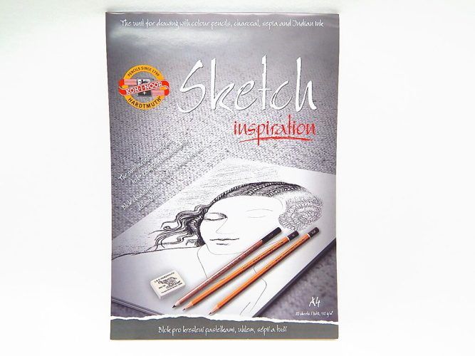 Lepený skicák s předtištěnými motivy pro kreslení pastelkami, sépii, uhlem, tužkou a tuší. Lepený skicák s předtiskem pro uhel, tužky a sépie tuš a pastelky. Na přední obálce název Sketch inspiration, barevný motiv. formát A4 – 20 listů a každý s jiným předtištěným motivem. Zadní část obálky: karton + návod k použití. Lepení v hlavě. Na záložce obálky na zadní straně bloku – jazykové mutace, text v anglickém jazyce. Jeden blok zabalený do smršťovací fólie. Rozměr 297 x 210 x 5 mm.