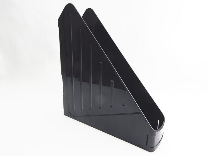 Box kancelářský svislý černý. Svislý kancelářský box vyrobený z černého plnobarevného polystyrenu. Jedná se o zásuvku se zkosenými bočními stěnami, která slouží k ukládání a archivaci dokumentů a složek na pracovním stole nebo ve skříni. Dokumenty a složky se ukládají svisle. Je určena pro velikosti A4 a menší. Svislý box je určený k použití v kanceláři, ale i pro hobby. Svislé boxy jsou bez spotřebitelského obalu.