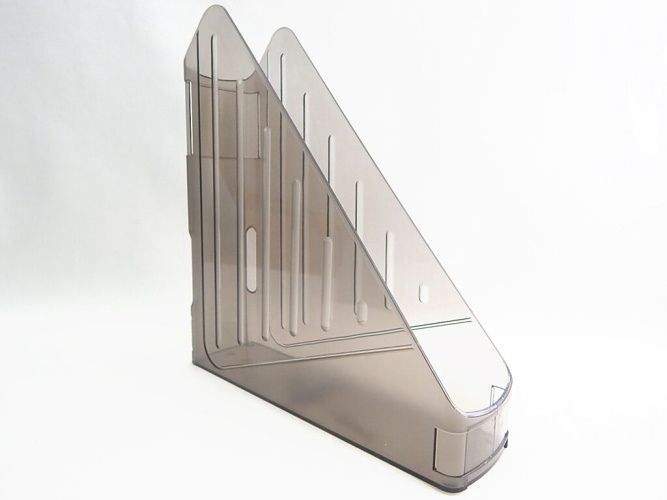 Svislý kancelářský box vyrobený z kouřového černého průhledného polystyrenu. Jedná se o zásuvku se zkosenými bočními stěnami, která slouží k ukládání a archivaci dokumentů a složek na pracovním stole nebo ve skříni. Dokumenty a složky se ukládají svisle. Je určena pro velikost A4 a menší. Svislý box je určený k použití v kanceláři, ale i pro hobby. Svislé boxy jsou bez spotřebitelského obalu.