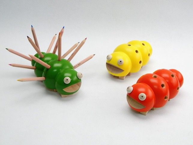 Stolní stojánek ve tvaru housenky s 12 krátkými pastelkami. Housenky mohou být ve třech barvách: žlutá, zelená, červená. Jsou vhodné do obchodů, jako dárek nebo na pracovní stůl.