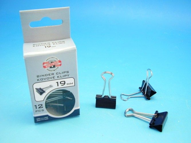 Kovové klipy 19 mm, výška je 37 mm, šířka v nejširším místě je 19 mm. Stiskací mechanika je černá, stiskací držáky poniklované. 12 ks klipů je vloženo do potištěné krabičky. Klipy se používají na sepnutí více kusů papírů.