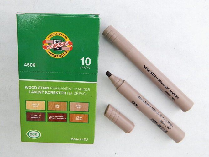Lakový korektor na dřevo 4506 buk. Začkovače plněné inkousty na alkoholové bázi, v odstínech dřeva. Stopa písma je odolná otěru a působení vody a povětrnostních vlivů a je světlostálá.Jsou určeny pro kolorování a opravy menších ploch dřeva, nábytku, podlah a podobných materiálů. V případě potřeby je možné stopu z neporézních materiálů smýt lihem.Jsou osazeny klínovými hroty o průměru 5 mm a je možné psát šířkou stopy písma 1- 5 mm, délka 400 m. Baleny jsou v papírových krabičkách po 10 ks v jednom odstínu, v soupravách po 6 ks v PP etuích nebo v 1 ks blistru. Vyrobeno v EU.