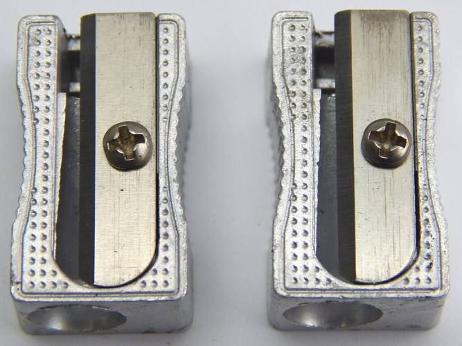 Výrobek se používá jako školní ořezávátko. Kovové (zinek) ořezávátko vykrojené, vroubkaté, na O tužek 6,5-7,5 mm. Délka 26 mm, šířka 16 mm, výška 11 mm.