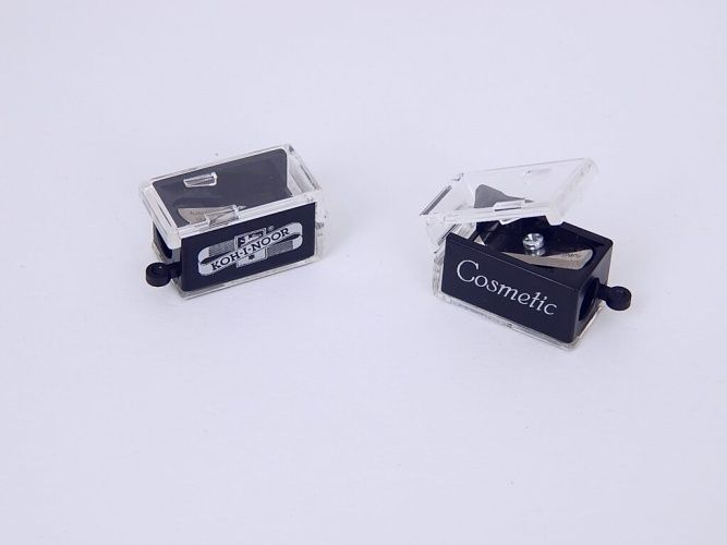 Výrobek se používá jako ořezávátko na kosmetické tužky. Plastové ořezávátko kontejnerové, černé, horní a dolní průhledná odklopná část, napravo od otvoru na tužky vložena černá tyčinka – odstraňovač zbytků tuhy z ořezávátka. Na 1. boční straně stříbrný potisk „Cosmetic“, na 2. boční straně stříbrná mašle. Délka 34 mm, šířka 16 mm, výška 17 mm.