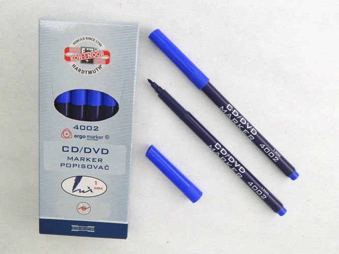 Popisovač permanentní 4002 kulatý modrý CD/DVD. Popisovače plněné inkousty na alkoholové bázi, odstín červený,modrý,zelený,černý. Stopa písma je odolná otěru a působení vody.Jsou určeny k popisování CD,DVD a BD disků.V případě potřeby je možné popis odstranit lihem.Jsou osazeny kulatými hroty o průměru 2 mm a je možné psát šířkou stopy písma 1 - 2 mm, délka 600 m.Baleny jsou v papírových krabičkách po 12 ks v jednom odstínu,v soupravách po 4 ks v plastových krabičkách nebo v 1 ks PP sáčku. Vyrobeno v EU.